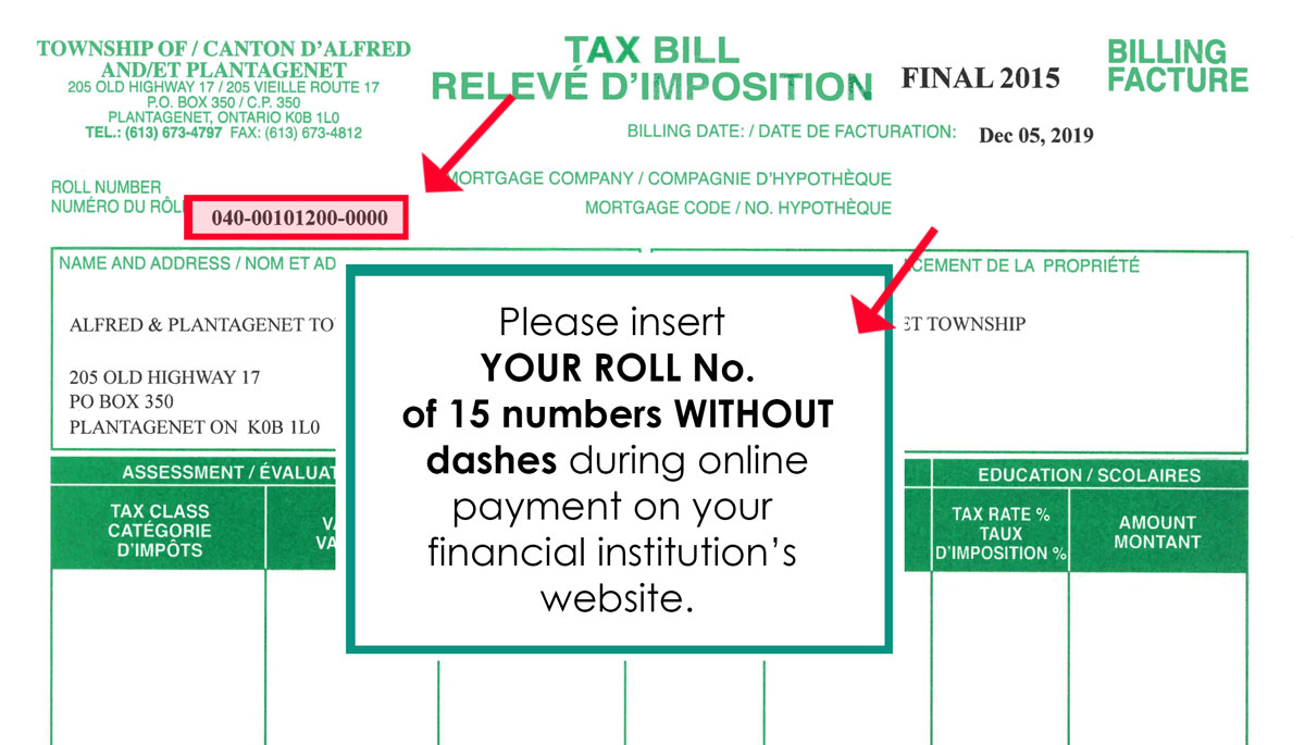 Payment must be received by the Township of Alfred and Plantagenet by the date indicated on your tax bill.